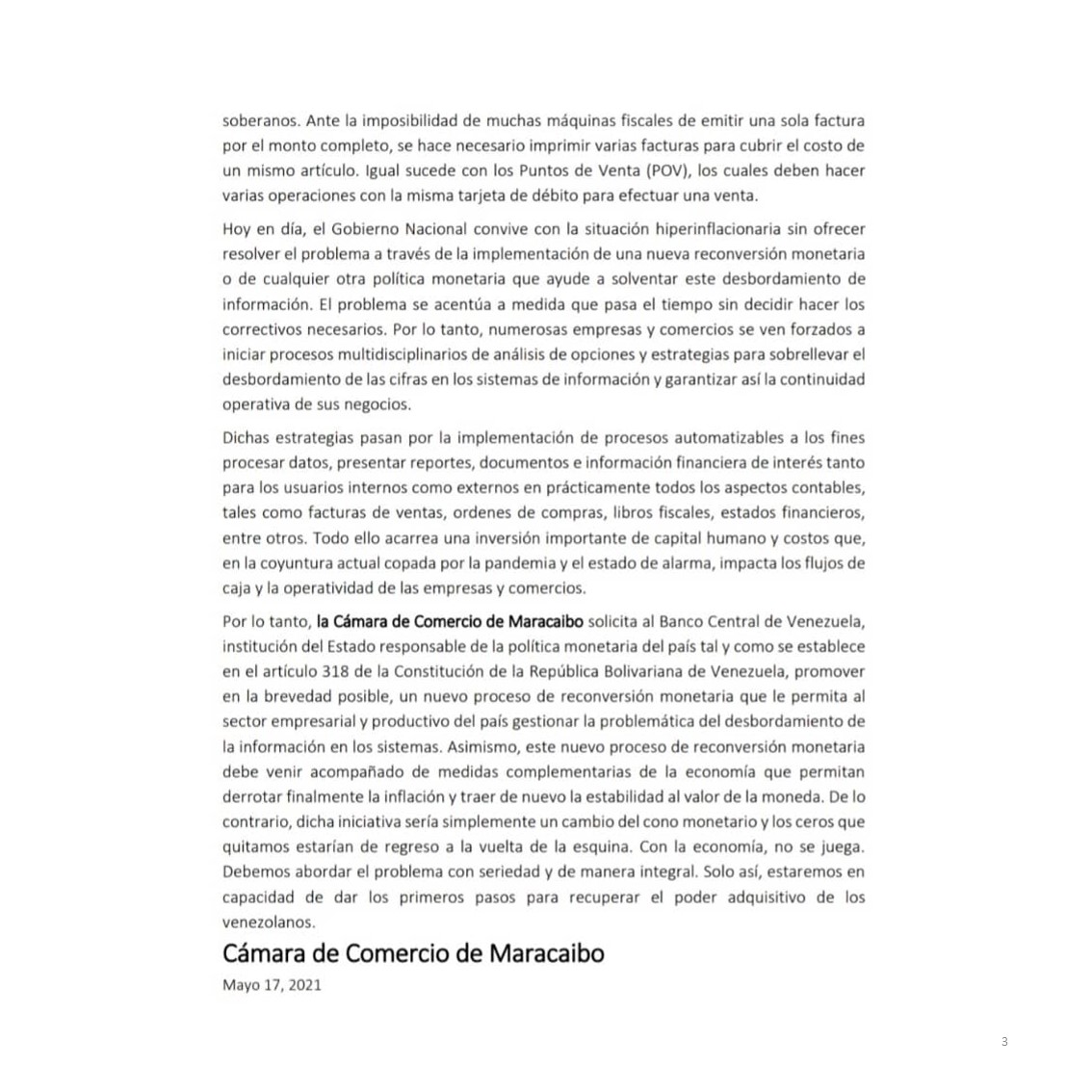 La Cámara de Comercio de Maracaibo solicita al Banco Central de Venezuela, institución del Estado responsable de la política monetaria del país tal y como se establece en el artículo 318 de la Constitución de Venezuela, promover en la brevedad posible, un nuevo proceso de reconversión monetaria que le permita al sector empresarial y productivo del país gestionar la problemática del desbordamiento de la información en los sistemas.