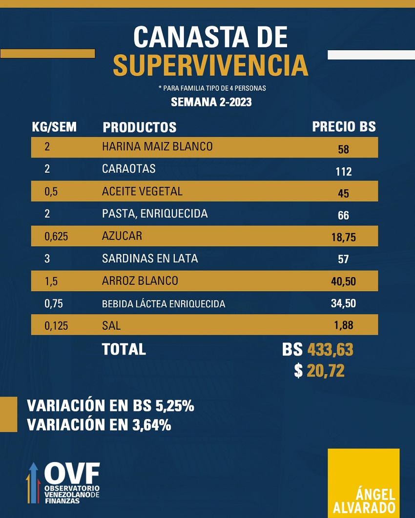 Una familia de 4 miembros necesitó Bs. 433,63 o US$20,72 para cubrir la Canasta de Supervivencia, en la semana 2 del año 2023.