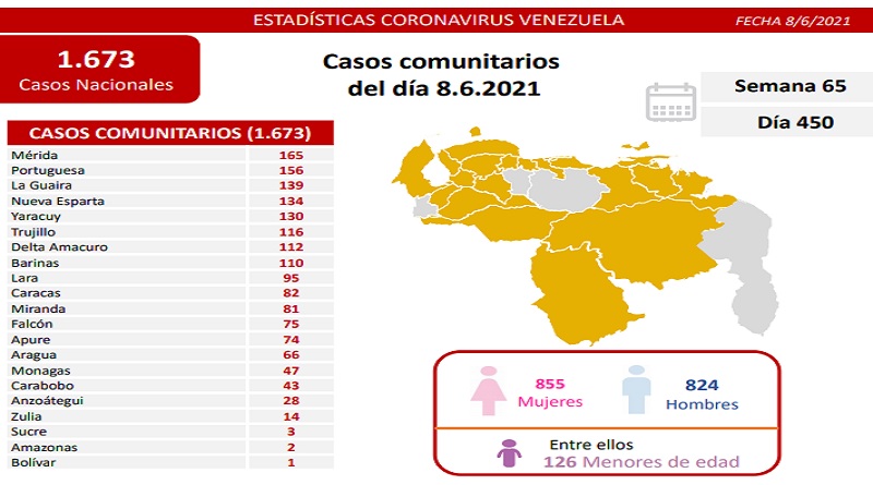 Un total de 1.679 casos de COVID-19 fueron detectados en las últimas 24 horas por las autoridades sanitarias venezolanas: 1.673 de transmisión comunitaria y 6 casos importados.