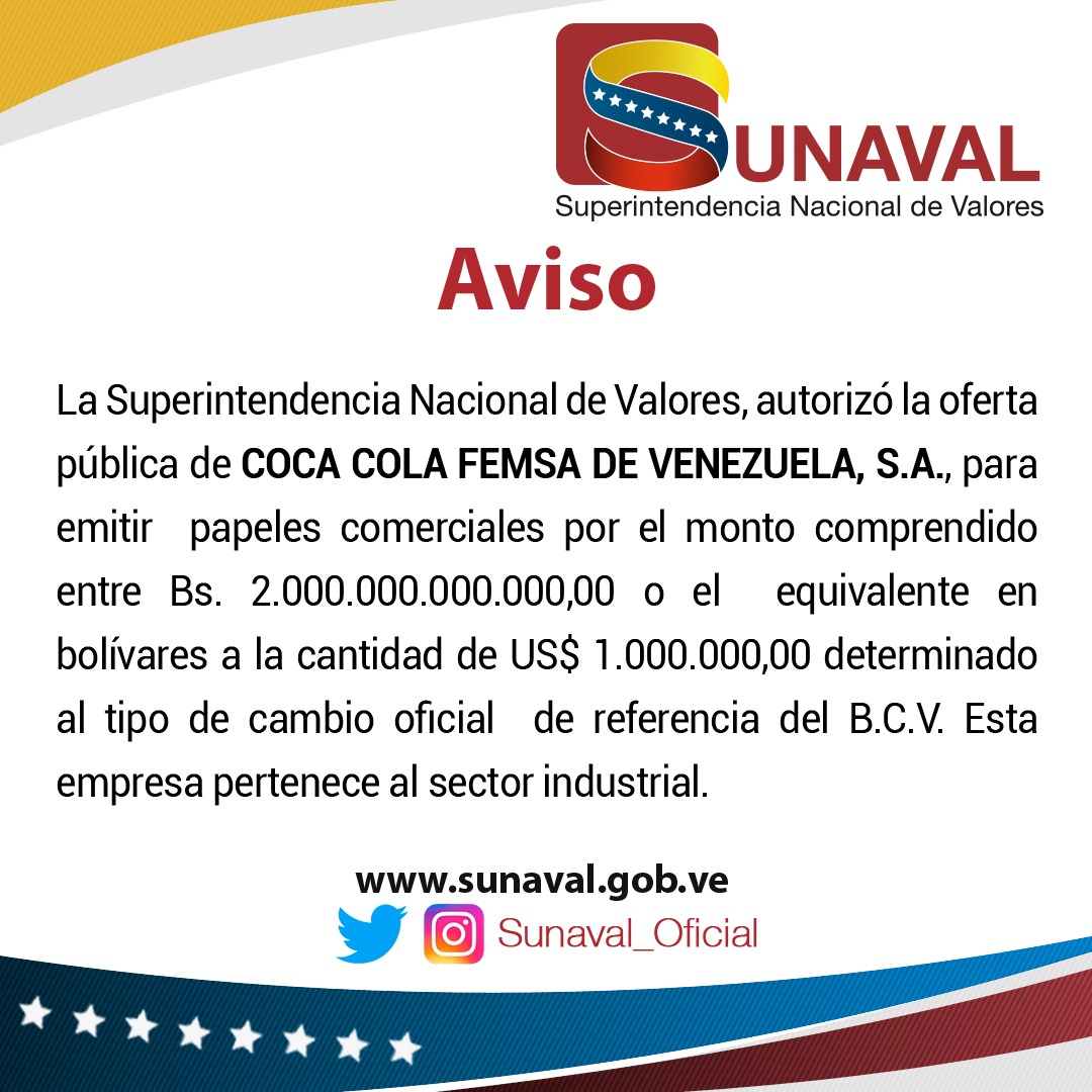 La Superintendencia Nacional de Valores (Sunaval) autorizó a la embotelladora Coca Cola Femsa de Venezuela S.A. a emitir papeles comerciales por un monto consolidado de 2 billones de bolívares o el equivalente en bolívares a 1.000.000 de dólares, expresados al tipo de cambio oficial reportado por el Banco Central de Venezuela (BCV).