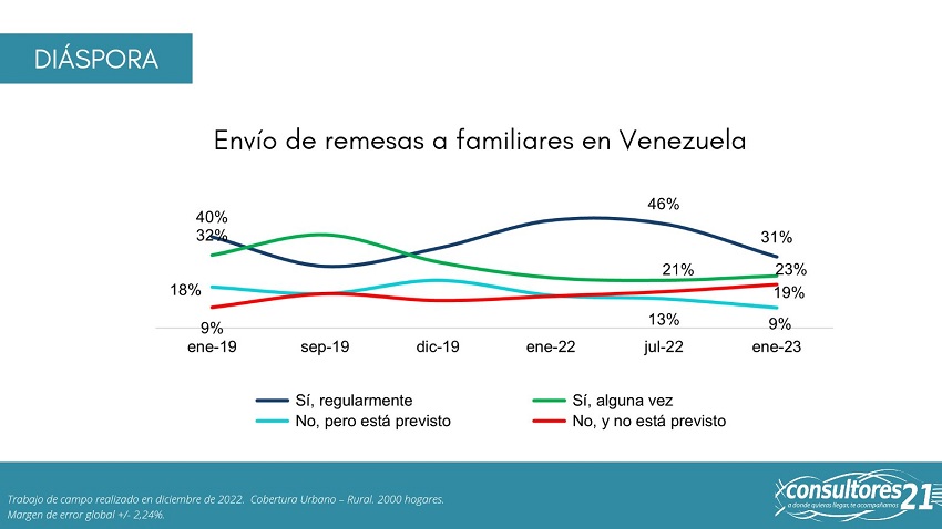 En enero de 2019, el 9% de los hogares venezolanos con familiares en el exterior no tenía previsto recibir remesas y en enero de 2023, es el 19%.