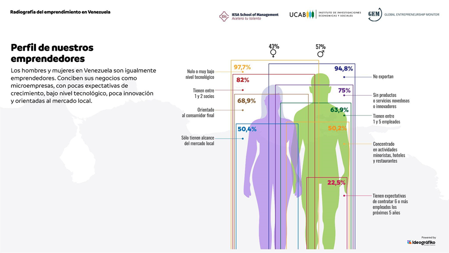 Por otro lado, con respecto a la actividad emprendedora por género, los profesores Monteferrante y Ojeda resaltaron que en los emprendimientos venezolanos de etapa temprana el promedio de participación de mujeres es de 21,41% y de hombres es de 23,96%, con apenas una diferencia de 2,55%.