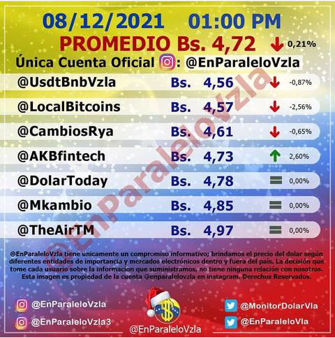 Dólar paralelo bajó otro 0,21% y cerró en 4,72 bolívares este #8Dic