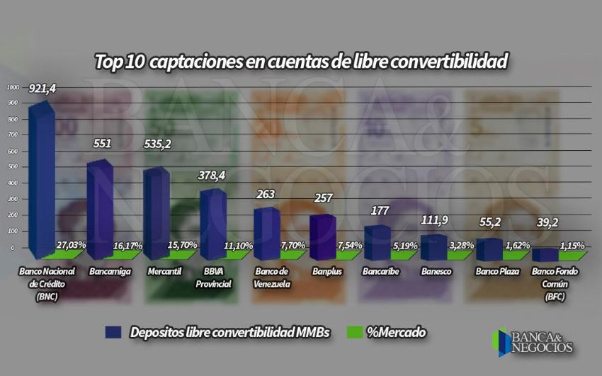 El Banco de Venezuela mantiene la mayor proporción de depósitos en moneda extranjera, pero porque conserva una cartera considerable de cuentas abiertas bajo el Convenio Cambiario N° 20, de manera que, pese a que esta institución reporta captaciones en divisas por un total de 2.321,4 millones de bolívares, que equivalen a 40,05% del total del segmento, sus captaciones de libre convertibilidad suman apenas 263 millones.