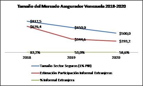 A esta altura, la realidad es que el tamaño aparente del mercado asegurador en Venezuela debe ser mayor por la presencia informal de las empresas internacionales de seguros de personas y asistencia en viajes, principalmente. Se estima que si la norma tradicional de la industria aseguradora en Venezuela, que es que su tamaño es 1% del PIB, entre 2016 y 2017 el tamaño del sector informal sería entre US$300 y 550 millones. Luego, para el 2018, alcanzó un tope de US$ 676 millones, cifra que fue consecuencia de la tardía respuesta del sector a la dolarización que clamaban los clientes del mercado asegurador.