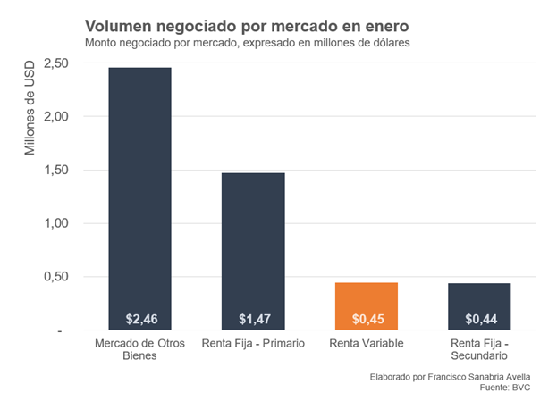 Ahora bien, en el mercado de otros bienes se negociaron 2,45 millones de dólares en el mes, 47% más a lo transado en diciembre y 20% más de lo negociado en papeles comerciales en enero, convirtiéndose así en el mercado de mayor volumen del mes.