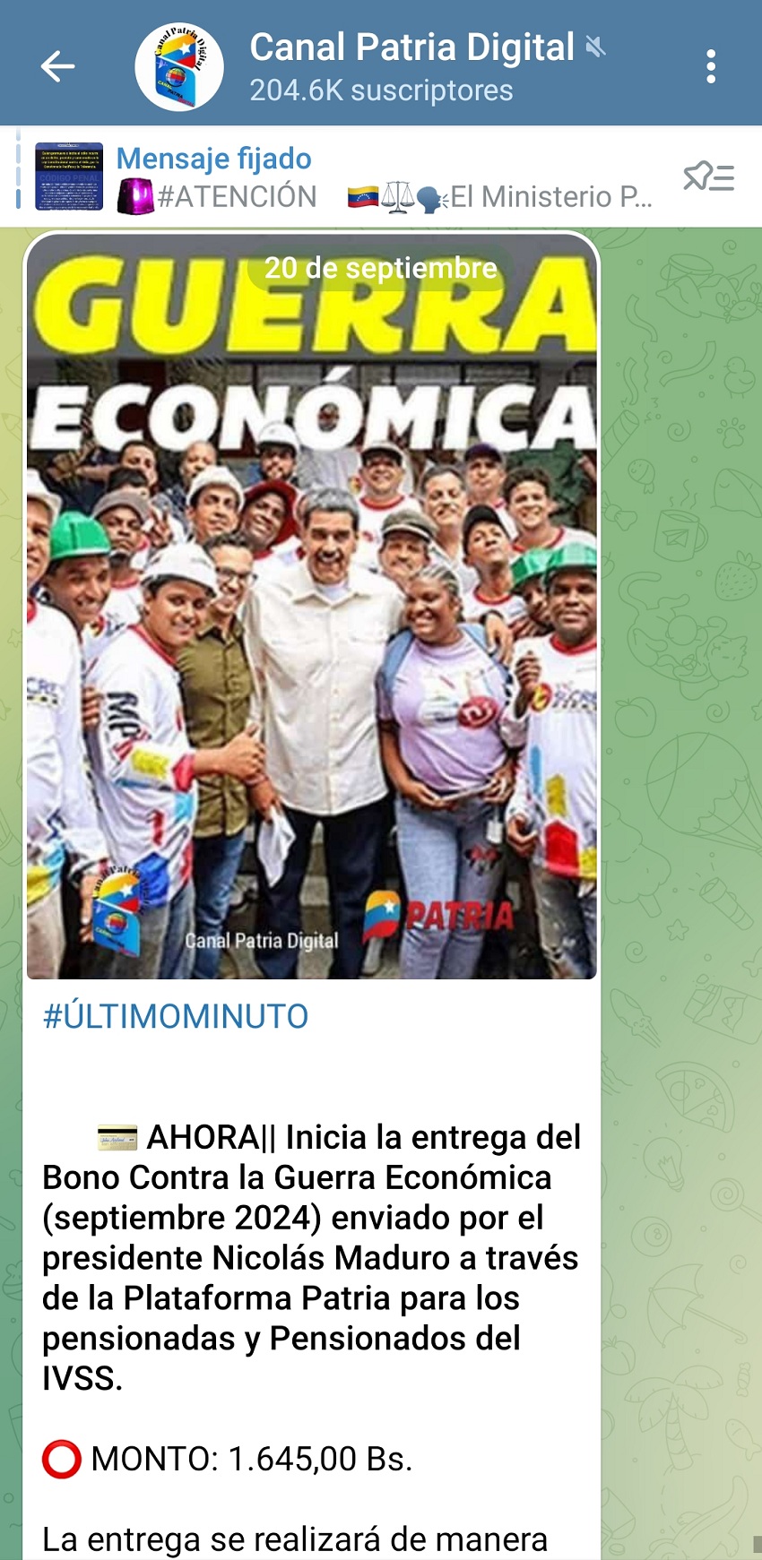 Este viernes 20 de septiembre de 2024, inició la entrega del bono «Contra la Guerra Económica», correspondiente al mes en curso, a través del Carnet de la Patria.