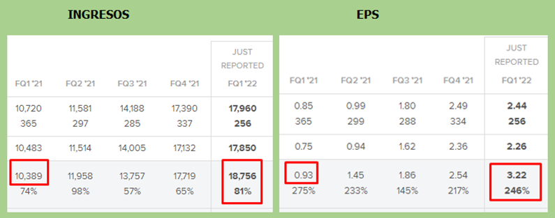 EPS: 3,22$ vs 0.93$. 246% arriba del 1T 2021, y muy superior a las expectativas de 2,26-2,44$