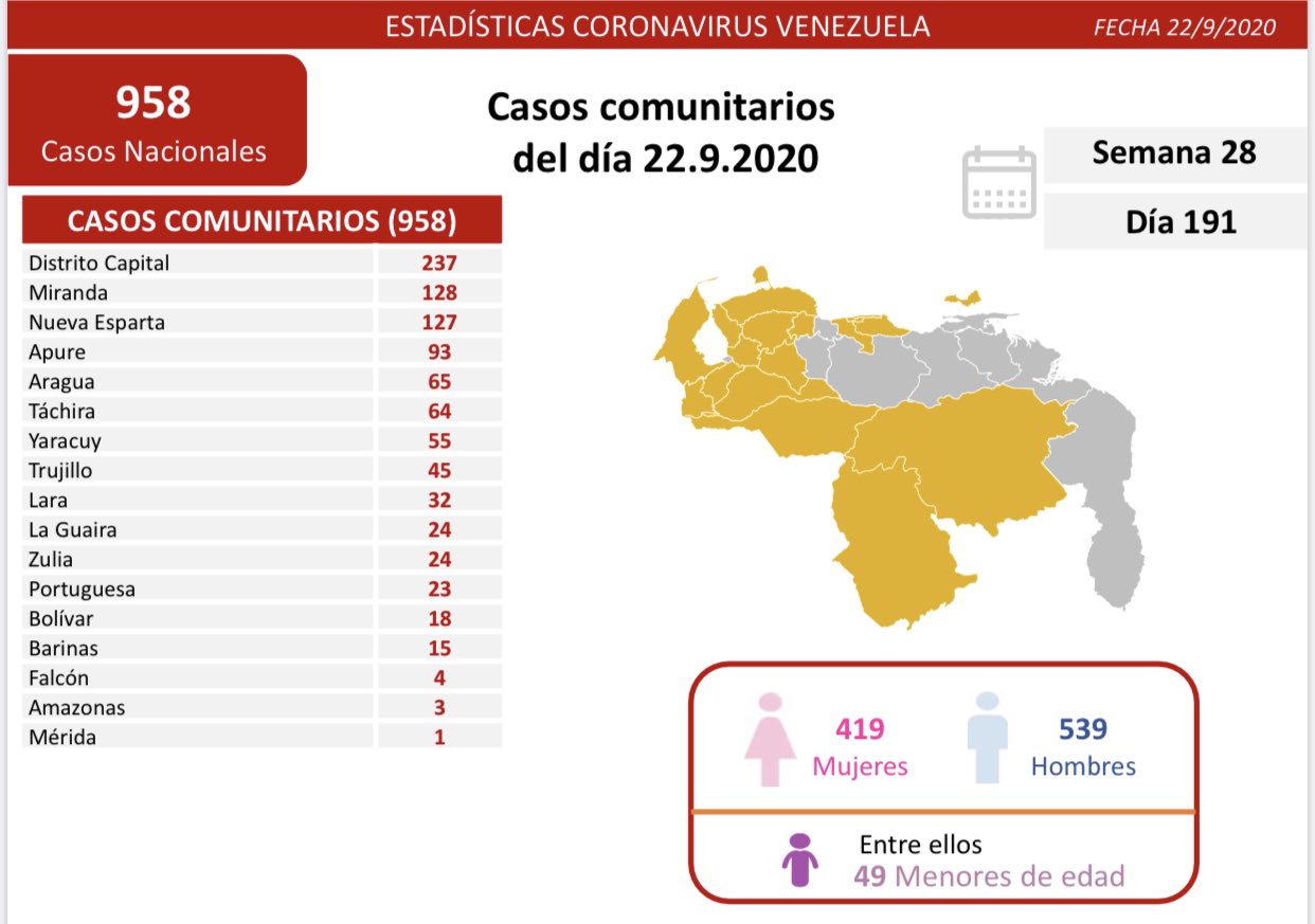 Los estados Miranda (128 casos) y Nueva Esparta (127) completan el trío de regiones que terminan este 22 de septiembre con más de 100 casos.